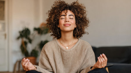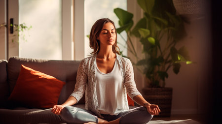 Serene young woman meditating at home embracing relaxation and mental wellness in living room