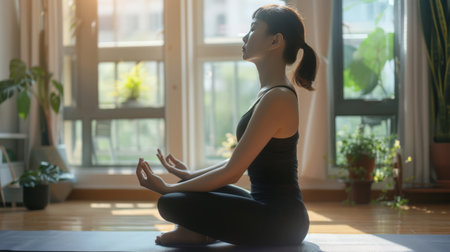 A woman engages in a calming meditation session in a bright indoor setting. Soft sunlight filters through the windows, creating a peaceful atmosphere for relaxation.