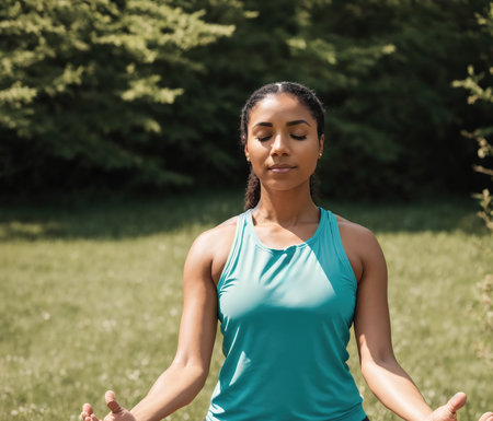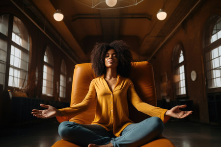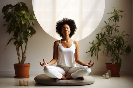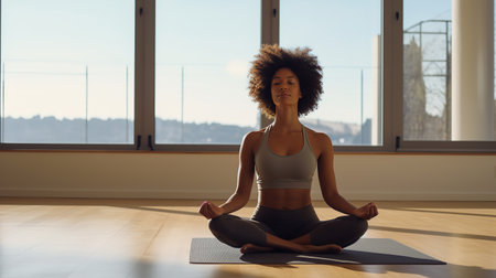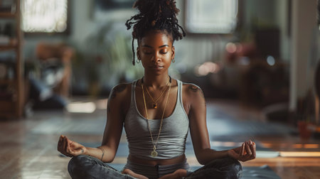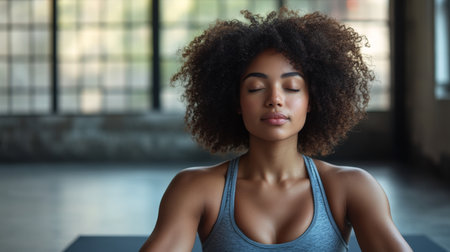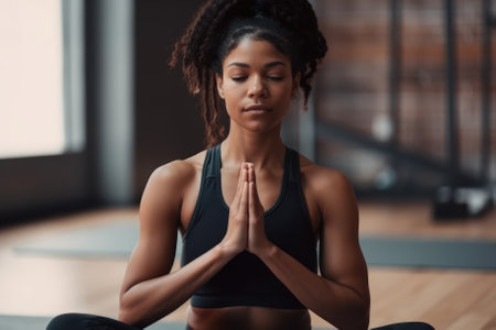 A black woman in a yoga class sits in a meditative pose, finding peace and tranquility in her surroundings. She is focused on her breathing, calming her mind and body, and embracing the present moment. Generative AI