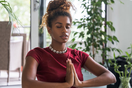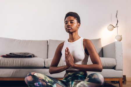 A plus size Black woman peacefully meditating at home.