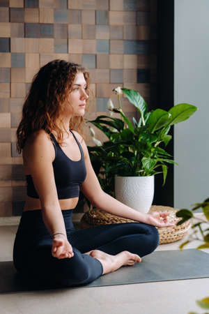 The girl sits in the lotus position in a cozy hall with a lot of greenery, practicing yoga at home.