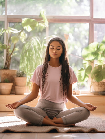 Woman practicing meditation indoors in a serene environment during morning hours for relaxation and mindfulness. Generative AI