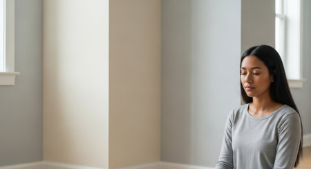 A woman enjoys a moment of meditation in a serene indoor space. Natural light spills through the window, creating calming patterns on the wall, enhancing her peaceful expression.