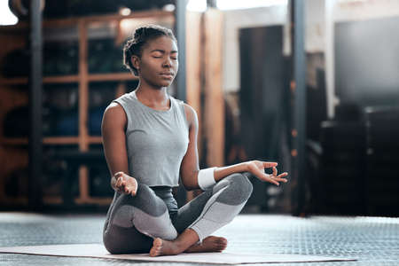 A dream I can follow through. Shot of a young woman doing some deep meditation at the gym.
