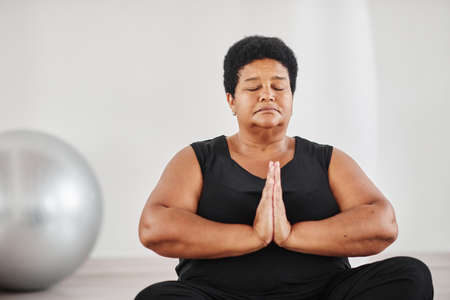 Portrait of African mature plump woman sitting in lotus position with her eyes closed and meditating during yoga