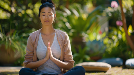 Female practitioner is meditating with hands in prayer position, surrounded by vibrant green plants, creating a serene atmosphere of peace and reflection