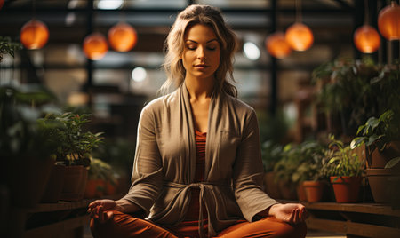 Young woman meditating peacefully indoors surrounded by lush green houseplants and natural light. High quality photo