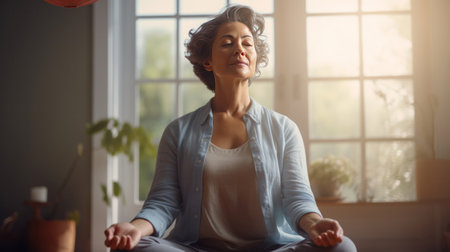 A middle aged woman meditating at home with eyes closed, relaxing body and mind in a living room. Mental health and meditation for no stress concept.