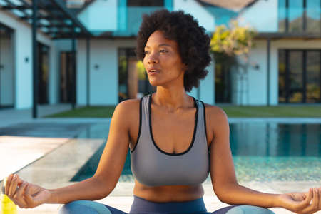 African american afro young woman looking away while practicing yoga on poolside. Unaltered, healthy lifestyle, yoga, fitness and active lifestyle concept.