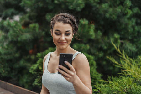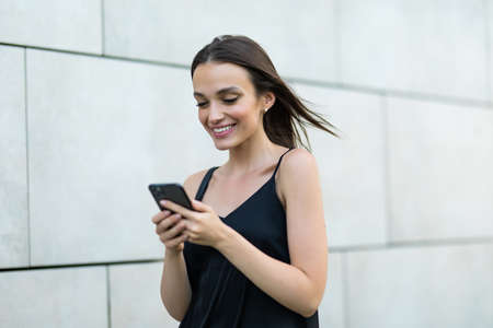 Close up of young woman with mobile phone on street in sunny weather. Portrait of female browsing smartphone and standing on fresh air