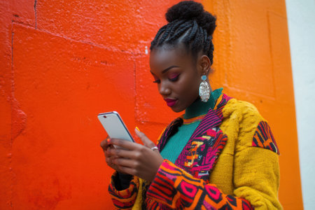 Stylish influencer using smartphone for social media microblogging against orange wall