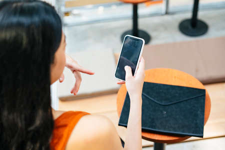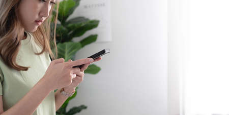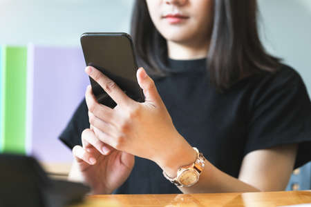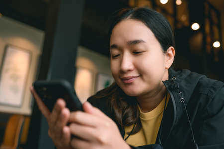 Happy Asian woman holding and using mobile phone in cafe or coffee shop with copy space.