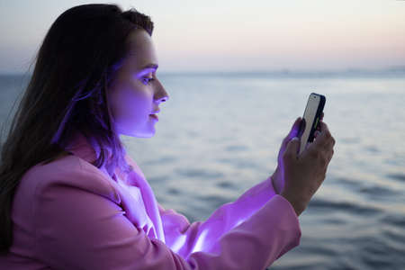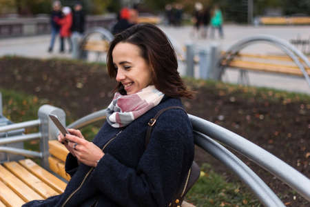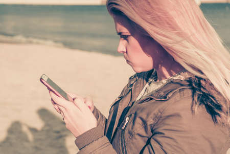 Social media, technology, modern devices, internet concept. Woman teenager wearing warm coat using her smartphone while walking outside on beach