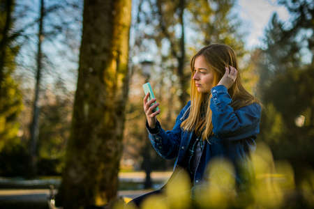 Cute blonde girl with long hair, septum piercing and jeans shirt using her telephone as a mirror in a park with strong sunny backlight. Looking towards the phone and holding her hair with one hand.