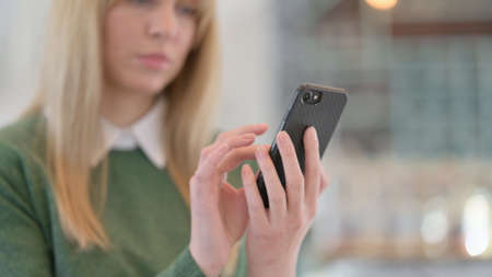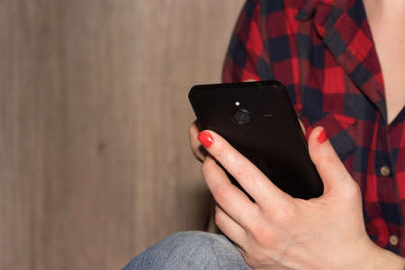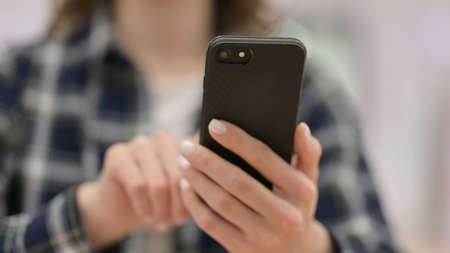 Close up hand of woman using smartphone, texting text message, hipster touch screen on smartphone light bokeh, girls using in hands cellphone close up, online internet