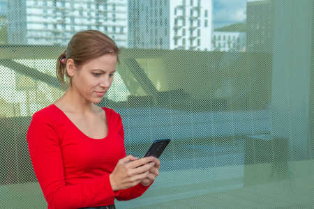 Beautiful woman in red standing in front glass wall with reflection and using smartphone. Copy space on reflection of modern building view..
