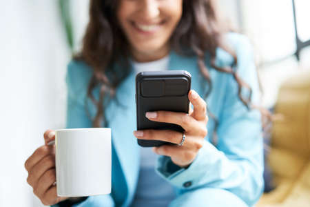 Close-up of hands of unrecognizable business woman drinking coffee sitting on a sofa while using a smart phone. Smiling working woman sends text messages from cell phone, working online.