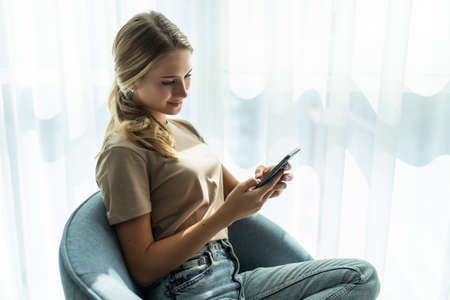 Lovely message from him. Beautiful young smiling woman looking at her smart phone while sitting in a big comfortable chair at home