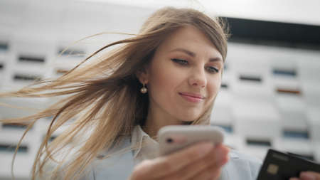 Attractive woman is entering credit card number for online shopping using mobile phone smartphone, communication technology, banking money, finance browsing paying slow motion. E-banking app service