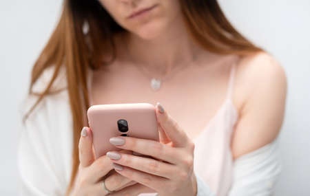 Female hands young woman using pink case smart phone social media, checking news, playing mobile games or texting messages close-up. Gadget blogging