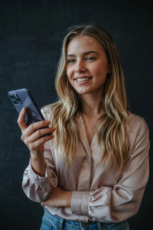 A cheerful girl interacts with her phone, her expression showing light amusement. The photo captures modern youths connection to technology and the positive impact of digital content.