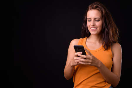 Portrait of young cool woman holding smartphone. Sending text messages. Isolated on background