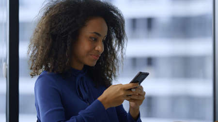 Happy african american business woman texting mobile phone browse social media in office building. Young black hair ceo typing message in corporate chat. Professional communication technology concept.