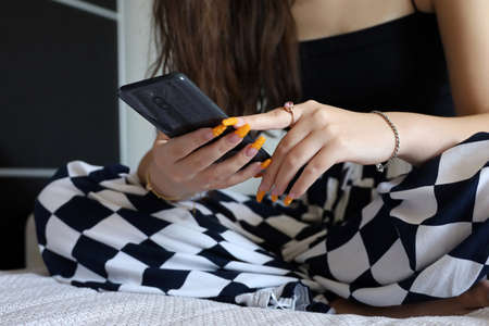 Smartphone in hands of girl with orange acrylic nails long hair sitting on a sofa. Female fashion and beauty, online communication, using mobile phone in home