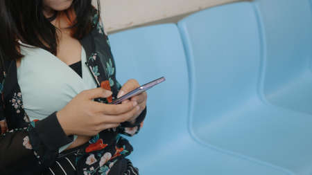 Young woman standing on the subway train in the morning during going to work and using smartphone for chat social media, people transportation concept
