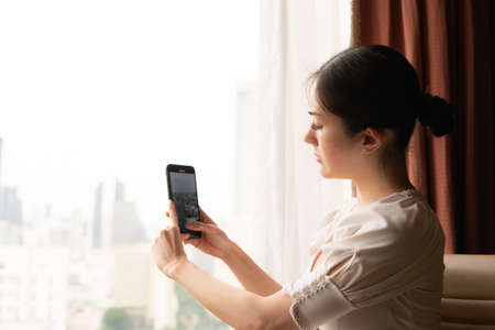 A young businesswoman who travels all over the world to do business. must stay and live in a hotel as a place to relax and sleep as well as used as a workplace