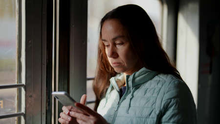city dweller woman is using suburban train for travelling to work, using smartphone