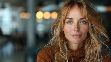 Portrait of beautiful woman with blond hair looking at camera in cafe