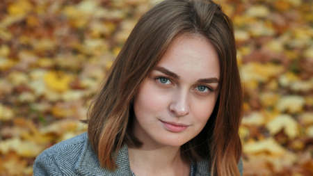 Portrait of a young and beautiful girl against a background of yellow leaves. Face close up.
