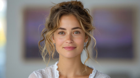 A young woman with wavy hair, wearing a light sweater, looking directly at the camera with a neutral expression, soft lighting in the background