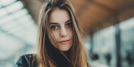 A young woman with long, light brown hair and blue eyes looks directly at the camera. She is wearing a black turtleneck and a black puffer jacket. The background is blurred, suggesting an indoor public space like a train station or airport terminal.