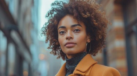 A woman with curly hair is wearing a yellow jacket and standing on a rooftop. Concept of confidence and style, as the woman poses for the camera with her head tilted