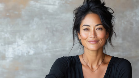 AI Generated. A woman with a blue shirt and a smile on her face She is standing in front of a gray wall