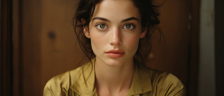 Portrait of a beautiful young brunette woman in a yellow shirt.