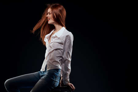 pretty woman sitting on a chair posing white shirt jeans long hair red lips dark background