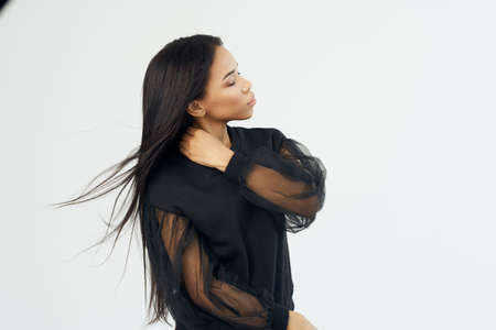 Woman in black dress with bared shoulders on gray background Copy Space cropped view