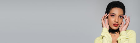 Short haired african american woman with red lips touching face isolated on grey, banner