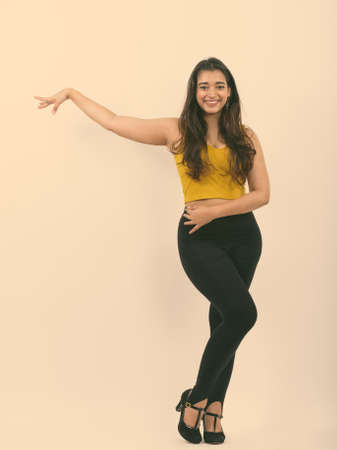Full body shot of young happy Indian woman smiling while posing with arm raised