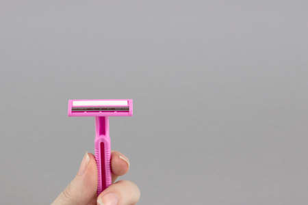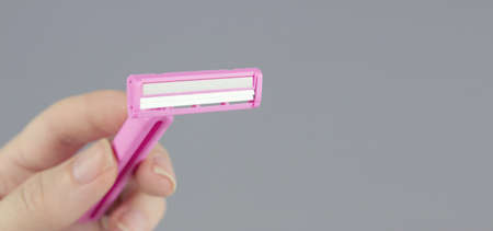 Hygiene skin care concept. Young woman holding in hand disposable pink razor blade in bathroom, closeup