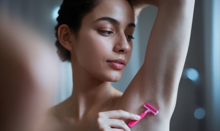 Woman using a pink razor to shave her armpits, reflecting in the mirror