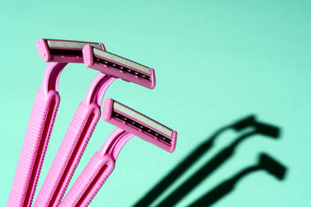 Disposable razors, a creative composition of disposable razors on a turquoise background, a minimalist concept