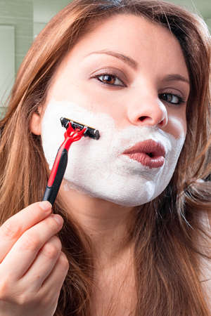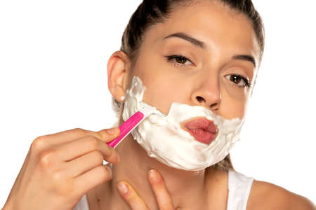 Beautiful young caucasian woman shaving her face by razor on white background. Pretty woman with shaving foam on her face