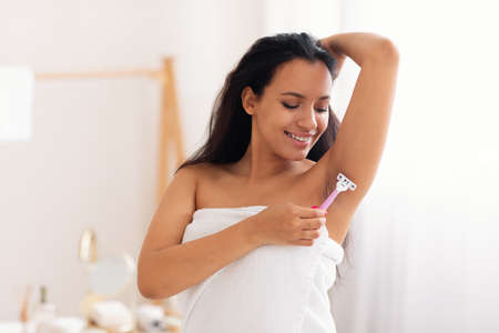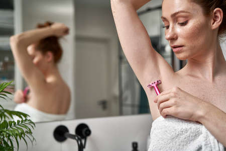 Close up woman shaving armpit in the bathroom
