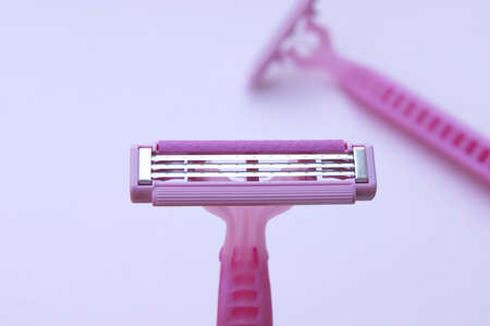 Man and woman body treatment of depilation with razor and skin care concept. Closeup view with selective focus of pink disposable shaver on pink background.