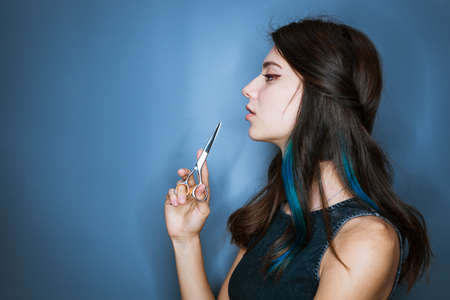 Cute young woman with brunette with blue strands of hair holding scissors near her face posing isolated on blue studio background. Beauty and hair care concept