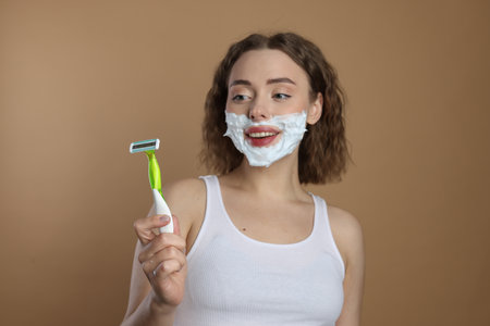 Happy woman with shaving foam on face holding razor against beige background